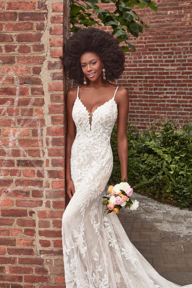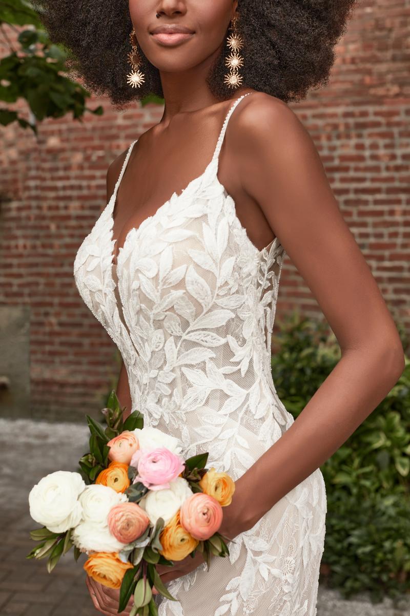 Giving romantic vibes and leafy feels, this is Jordan from the Spring 2023 Madison James Bridal gown collection. Rustling leaves and delicate branches arch across the bodice of this flirty sheath style, befitting your destination wedding or formal outdoor reception. Designed with a plunging neckline and demurely sexy illusion lace back. We love her illusion bodice but she's also available with a lined bodice for a more modest bridal gown feel. Please call our Dallas, Texas location to check in-store availability, pricing and current ship dates.