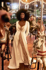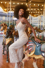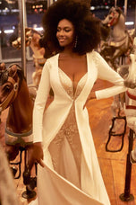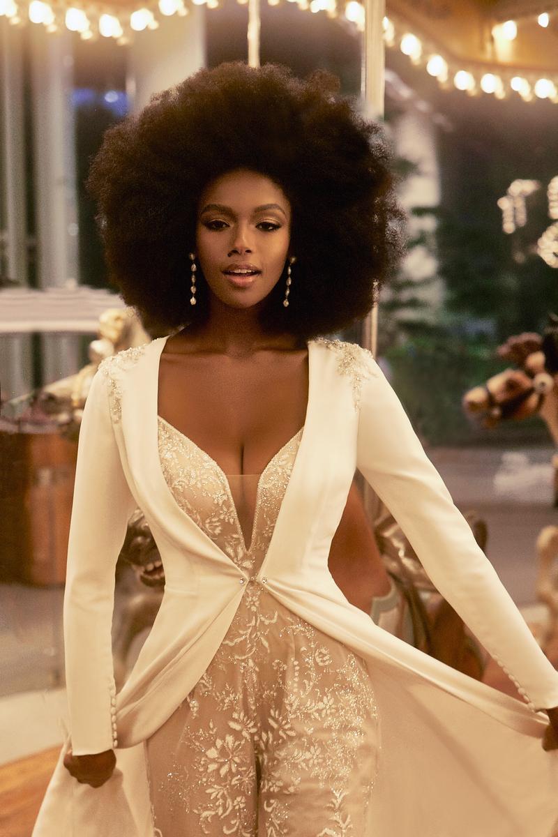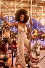 A modern take on the classic bridal gown vibe, this is Jagger, a unique and chic bridal jumpsuit from Madison James' Spring 2023 collection. Vintage-inspired and ready for action, she's designed with a plunging neckline and delicate straps, paired with a v-back and wide pant leg. Consider adding a little more drama for your Hollywood-inspired send off or a fabulous photo session with your betrothed by adding the long-sleeve jacket, complete with train and dramatic wide collar. We're obsessed! Please call our Dallas, Texas location to check in-store availability, pricing and current ship dates.