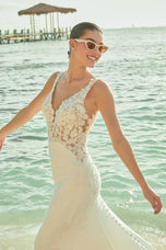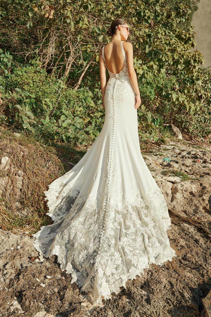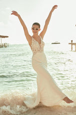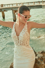 Imogene is a classic lace and crepe bridal gown from the Fall 2023 Madison James Bridal gown collection. Elegantly embroidered appliques cover the Chantilly lace and soft crepe of this sheath gown, ready to take centerstage at your destination wedding or modern reception. Designed with a plunging neckline and low, open back. Please call our Dallas, Texas location to check in-store availability, pricing and current ship dates.