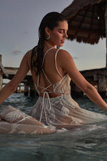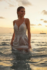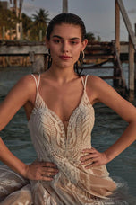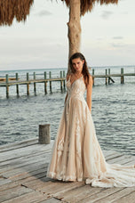 Unique and chic, this is Iliana from the Fall 2023 Madison James bridal gown collection. Boho-inspired and perfect for your ethereal destination wedding. Shimmering sequined lace appliques are overlaid on a tulle A-line skirt, for a truly modern yet classic bridal silhouette. We obsessed with the tie back and you will be too! She's even available in a shorter length to make alterations a breeze. Please call our Dallas, Texas location to check in-store availability, pricing and current ship dates.