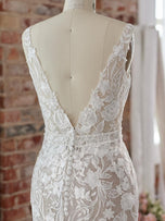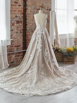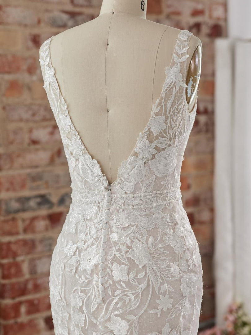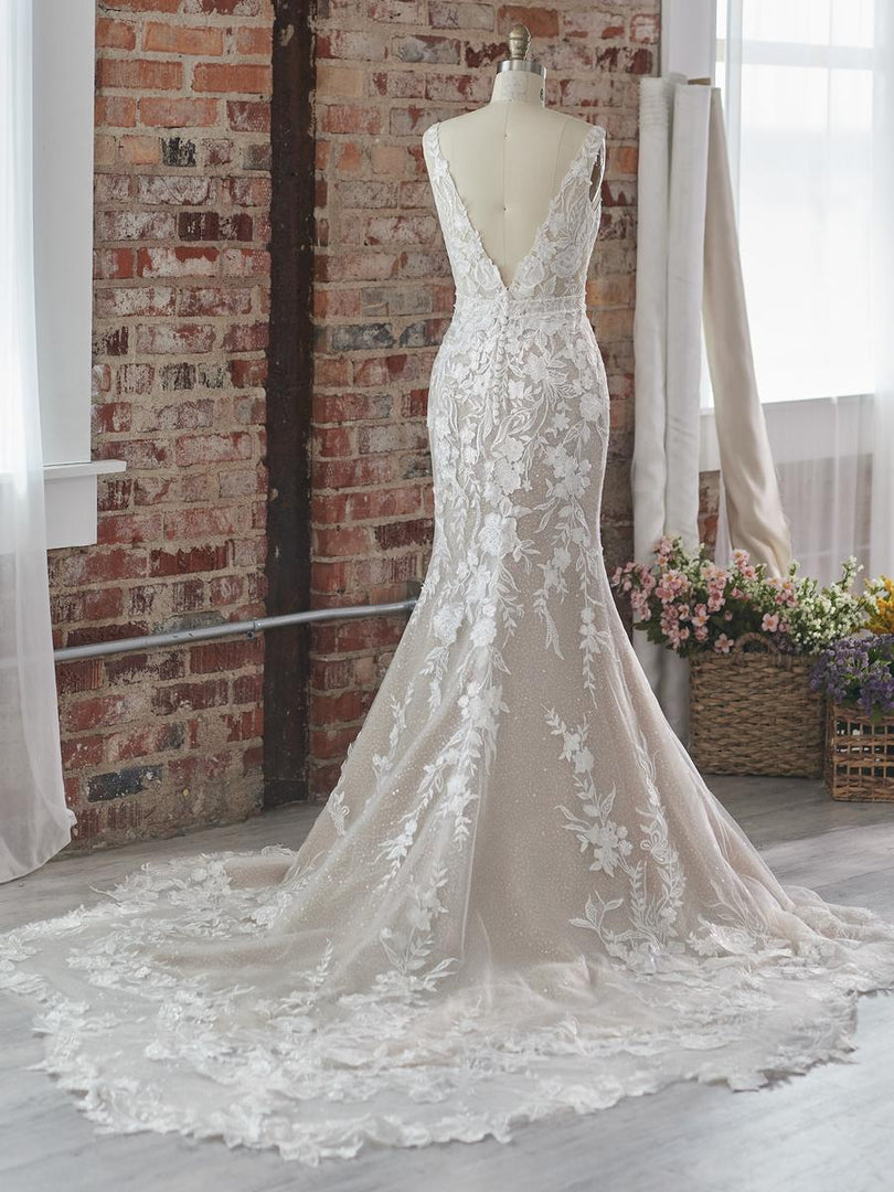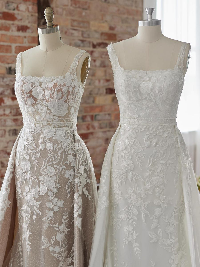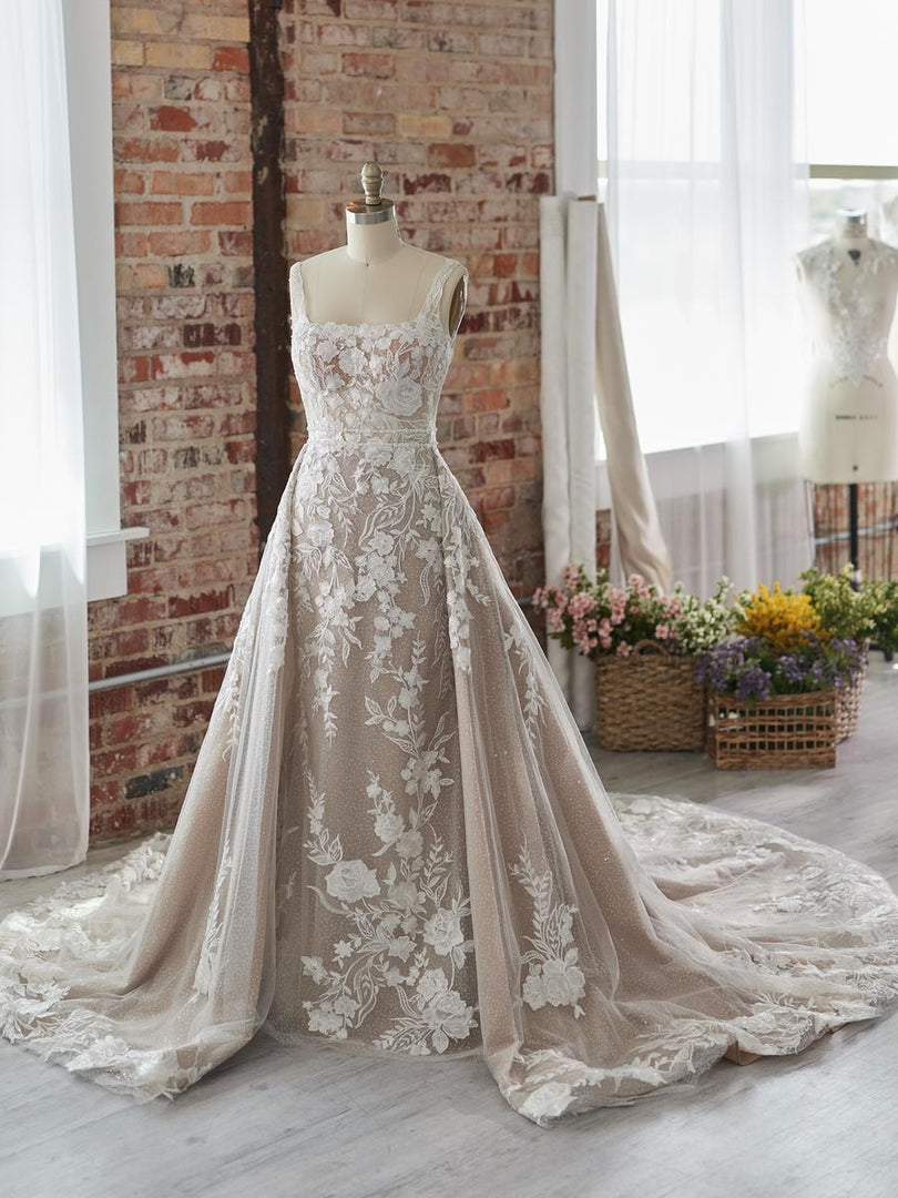 For all our beautiful boho-brides with an affinity for the outdoors, we present Albany from Maggie Sottero's Spring 2022 Bridal Gown collection. This nature-inspired wedding dress features a square neck line and low v-back on an illusion bodice with sequined lace motifs over beaded tulle throughout. A fit and flare silhouette can be accented with a full detachable train for extra drama at your formal ceremony. Please call our Dallas, Texas location to check in-store availability, pricing and current ship dates.