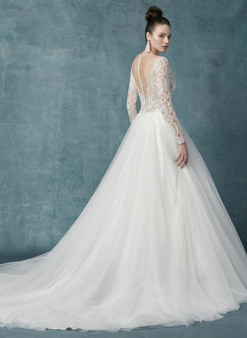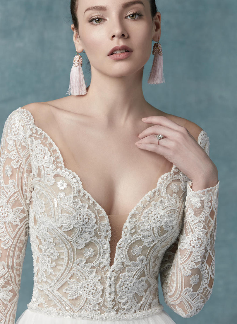 A beautiful, long-sleeved bridal gown, this is Mallory Dawn from Maggie Sottero's Spring 2019 Bridal Gown Collection. Full of elegance and romance, this wedding dress features Boho lace motifs adorn the nude bodice of this princess bridal gown. We're loving the illusion long sleeves with keyhole details, illusion plunging V-neckline, and illusion V-back. What could be better for your formal winter wedding?! Complete with voluminous tulle ballgown skirt with beading at the waist to make your feel princess fabulous!Please call our Dallas, Texas location to check in-store availability and current ship dates.