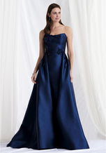 Make an unforgettable entrance in the MGNY by Morilee Overskirt Evening Dress 73155, a true masterpiece of evening gown design. This stunning gown is a bold statement in silhouette and detail, engineered to captivate with its refined elegance and customizable features.The foundation of this exquisite dress is a sleek column silhouette, crafted from luxurious mikado fabric that offers a subtle sheen and impeccable structure. The gown is impeccably tailored with princess seams, ensuring a flattering fit that sculpts the form beautifully. A truly unique feature is the scooped cat eye neckline, which provides a distinctive and modern edge to the classic column shape. Adding a delicate yet impactful contrast, textural 3D floral appliqus are strategically placed, bringing a soft, artistic dimension to the sleek design.Versatility is key with Style 73155. It comes complete with a removable overskirt and a matching stole, both adorned with the same beautiful floral appliqus. These elements offer customizable volume and versatility, allowing you to transform your look from a sophisticated column gown to a more dramatic, grand ensemble in moments. For those who prefer the streamlined column look, this dress is also available without the overskirt as Style 7315D. With the MGNY by Morilee 73155, you're not just wearing a dress; you're making an artistic statement that is both elegant and uniquely yours.