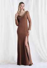 Embrace sophisticated elegance with the MGNY Cowl Neck Long Sleeve Evening Dress 73156. This fit and flare evening gown is a testament to effortlessly refined style, perfectly balancing fluid embellishment with tailored restraint.The dress sculpts a sleek silhouette from luxurious stretch crepe, a fabric known for its beautiful drape and comfortable, body-skimming fit. The true artistry lies in its unique neckline, where a draped beaded tulle cowl graces the neckline and long sleeves, adding a captivating whisper of shimmer. This delicate beading catches the light with subtle brilliance, creating an ethereal glow around the upper body and arms. The long sleeves offer elegant coverage, making this gown a perfect choice for events where a refined, modest yet undeniably glamorous look is desired. The cowl neck design adds a touch of classic sophistication, enhancing the overall allure of this exquisite evening dress.