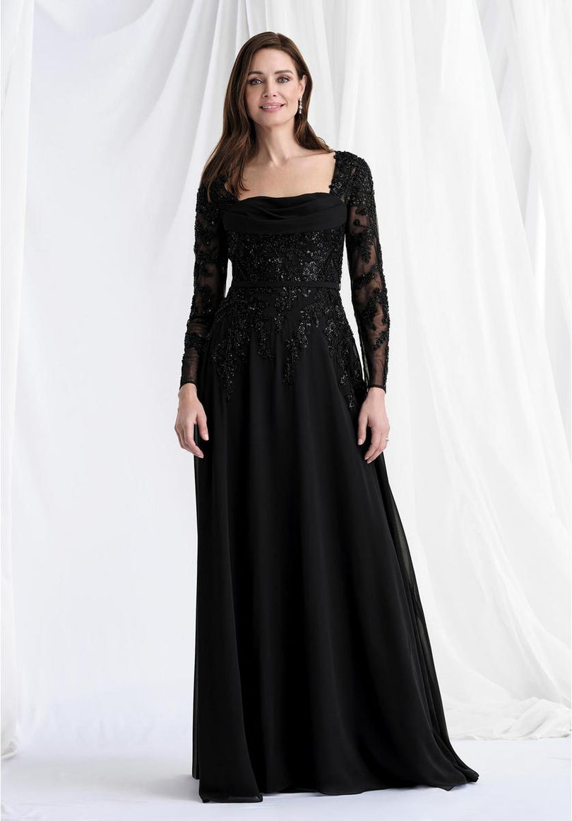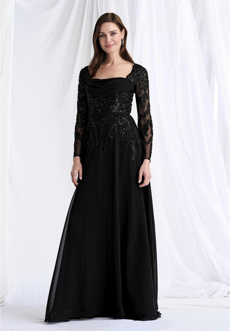 Step into a realm of ethereal elegance with the MGNY by Morilee Long Sleeve A-Line Evening Dress 73185. This enchanting evening gown is designed to provide a graceful and sophisticated presence, perfect for any special occasion where a touch of refined beauty is desired.The dress showcases a timeless A-line silhouette, expertly crafted from flowing chiffon that ensures a lightweight, airy drape and effortless movement. Its draped bodice offers a soft, elegant contour, leading into exquisite illusion net long sleeves. These delicate sleeves are adorned with intricate beaded appliqu, creating a captivating interplay of transparency and texture that adds a subtle shimmer and artistic detail to your arms. For added versatility and to beautifully define your waist, a detachable self-belt is included, allowing you to customize the fit and silhouette to your preference. With its delicate embellishments and graceful design, the MGNY 73185 is a testament to understated glamour and timeless charm, ensuring you radiate sophisticated allure.