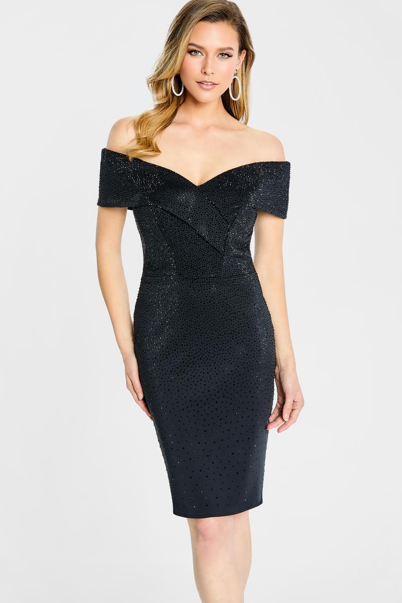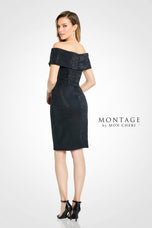 Dont have time for hemming? This Short, Montage gown by Mon Cheri is the one for you! 220949S, is created with a classy off-the-shoulder v neckline, thick cap sleeves and high zipper back. The fitted knee-length gown is made in figure flattering jersey fabric and adorned with sparkling stone accents that will sparkle from every angle. This is the perfect gown for Mother of the bride to Guest of any social occasion. Give our Mother of the bride department a visit or give us a call for additional details on this gem!