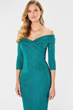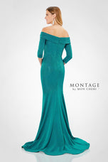 Soft yet sophisticated is how we describe Montage style 221970. This eye-catching number is covered in sparkling crystals that will have you gleaming all night. This gown has a beautiful off the shoulder neckline with 3/4 length sleeves for added coverage. This fit and flare gown is perfect for any special occasion.