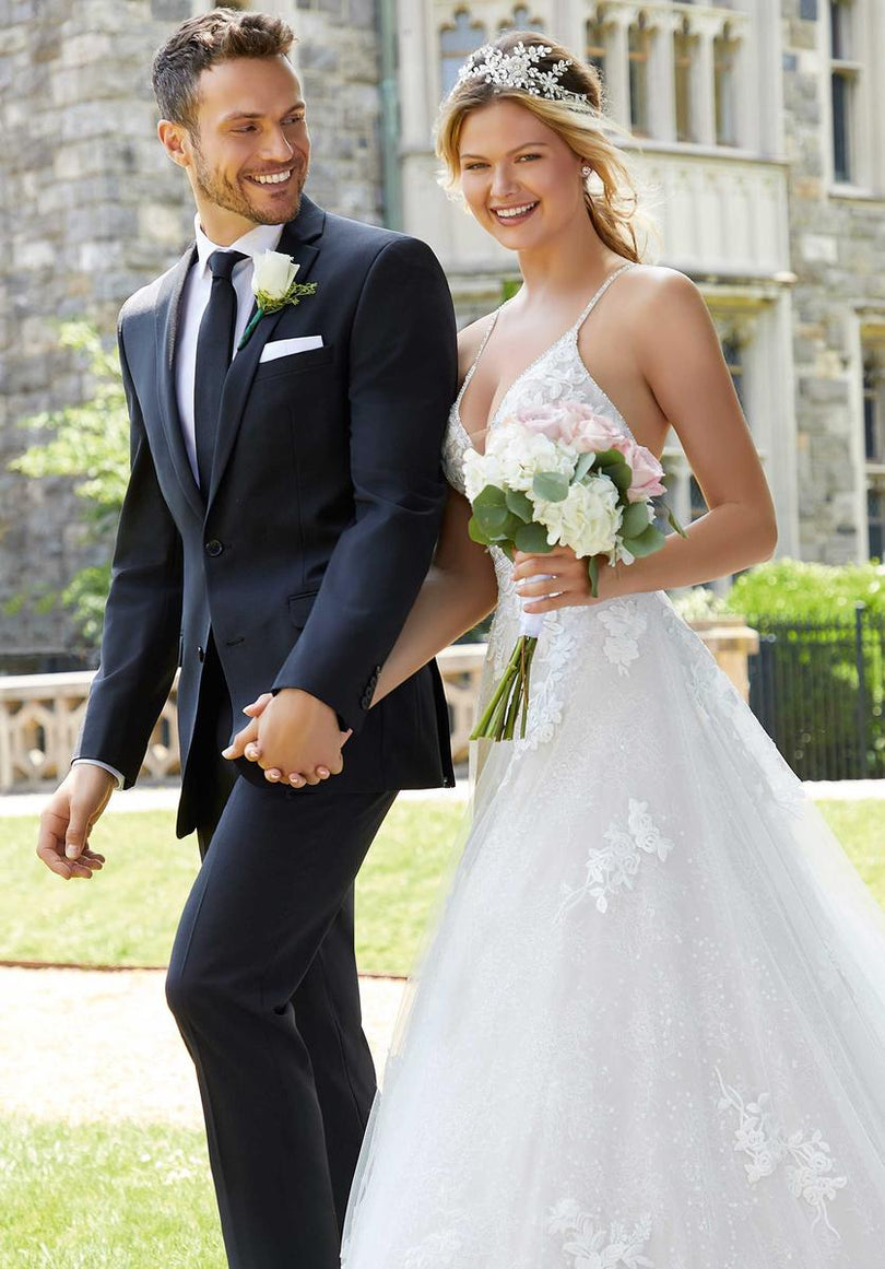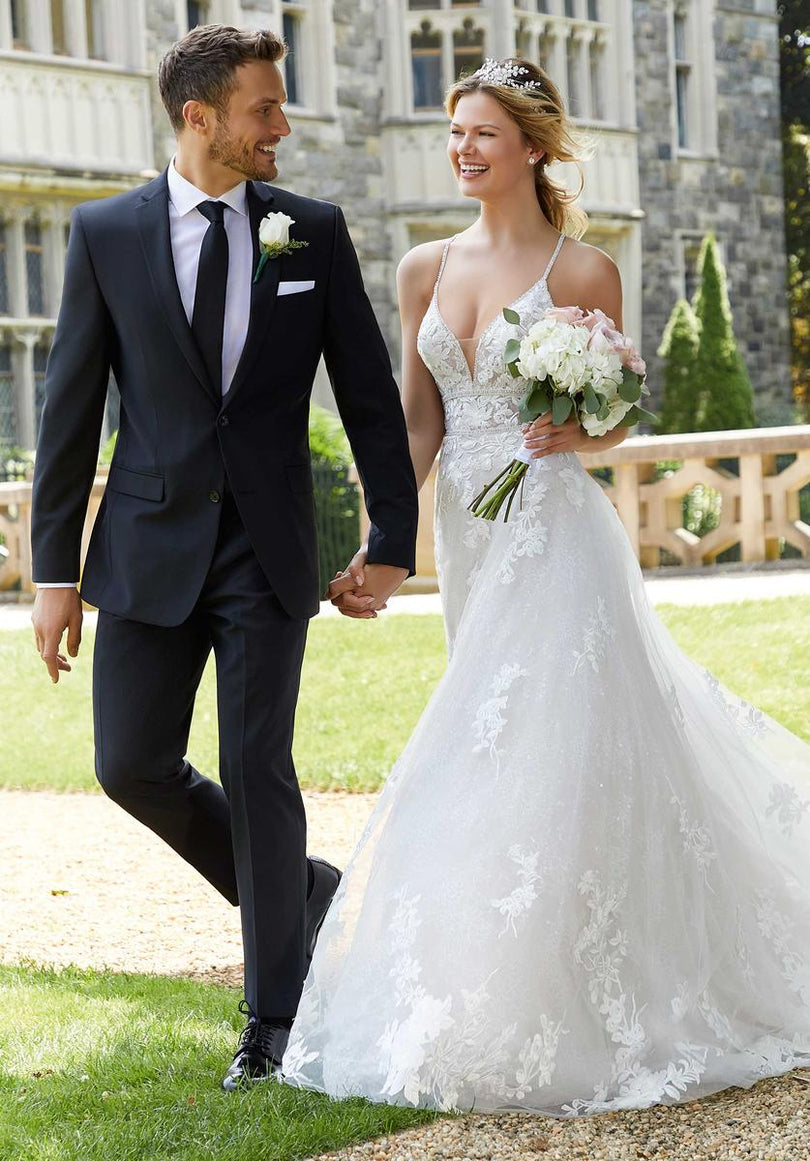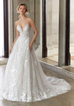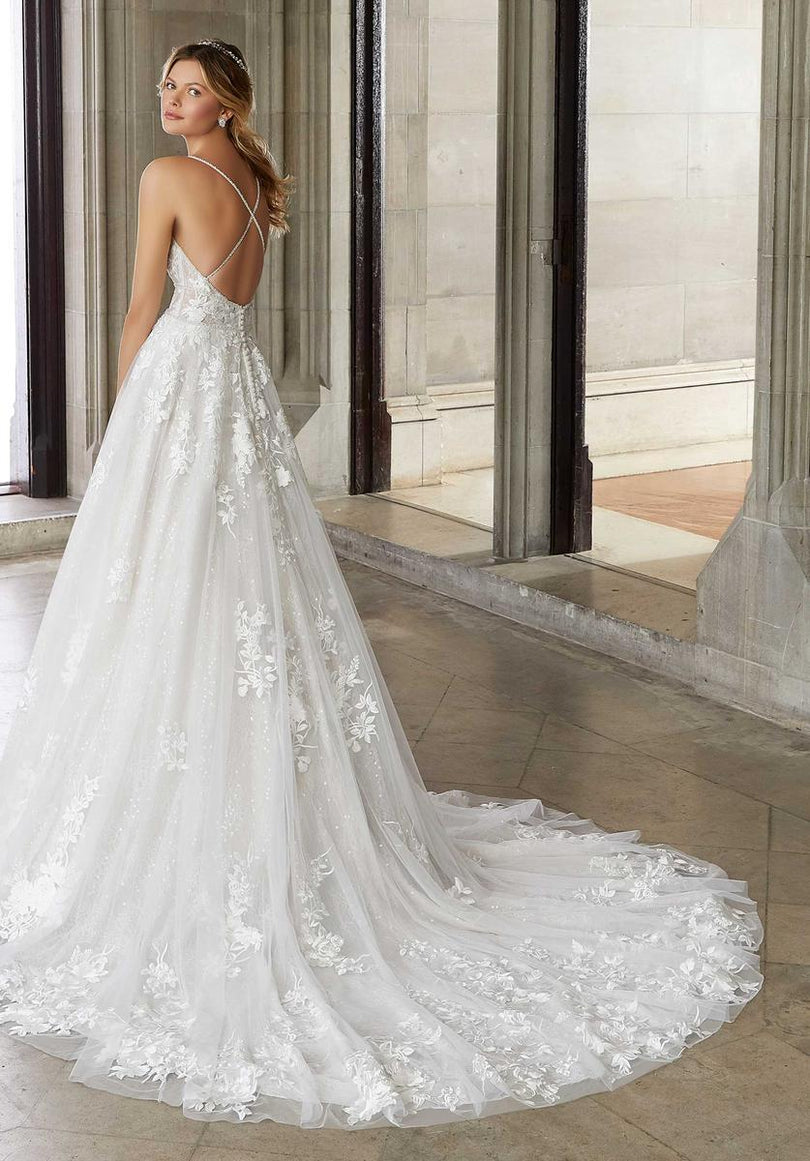 A flattering a-line with delicate straps, Skylar is an a-line wedding gown that steals the show in Morilee's Spring 2020 Bridal Gown collection. A chalk white beaded trim with boho-inspired, embroidered appliques perfectly accent the deep-v bodice of this look, just begging to be featured at your woodsy outdoor wedding! The net soft ball gown over sequined chantilly lace skirt create a truly magical sparkle effect. Available in three lengths: 55", 58", 61". Available in front bodice lining as style 2127L.Please call our Dallas, Texas location to check in-store availability, pricing and current ship dates.