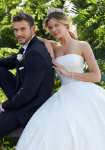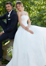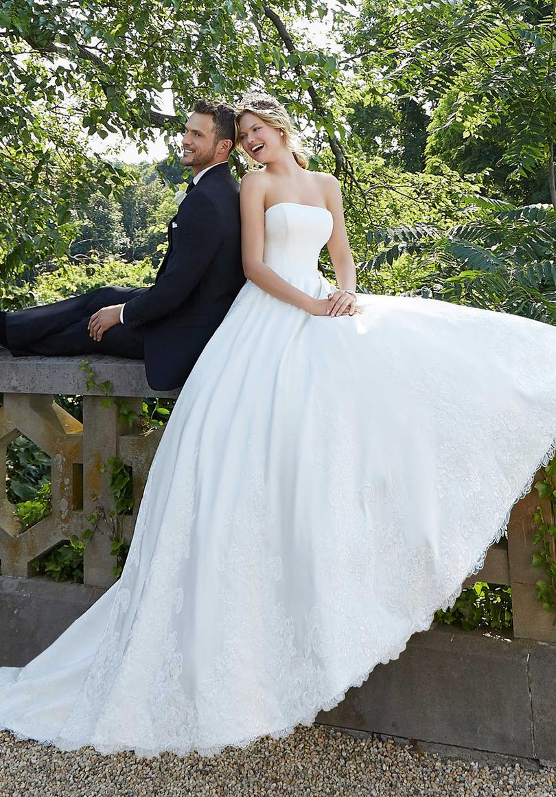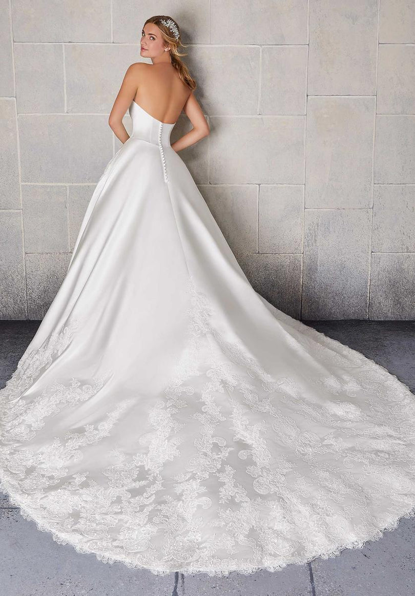 A perfectly modest yet modern pick for your Debutante Ball or formal church wedding dress, this is Sedona, designed exclusively for Morilee's Spring 2020 Bridal Gown collection. Chic and sophisticated, this duchess satin ball gown is delicately accented with frosted, vintage-inspired lace appliques and side seam pockets with a wide scalloped hemline. A straight neckline is a perfect pick for those hoping to leave a little to the imagination! Available in three lengths: 55", 58", 61". Please call our Dallas, Texas location to check in-store availability, current ship dates and pricing.
