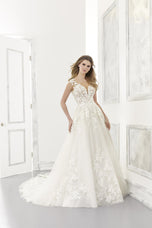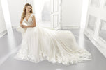 Fresh, feminine, and ultra romantic, the Agatha wedding gown, style 2173 is a fabulous a-line tulle ballgown from Morilee's Fall 2020 Bridal Gown collection! Featuring frosted embroidered lace appliqus on a tull gown, the V-neckline and sheer yoke makes way to the gorgeous illusion back trimmed in covered buttons. A wide hemline border trims the sheer train. What could be better for your ethereal, boho-inspired outdoor ceremony or formal church affair? Available in three lengths for our fave petite brides. Shown in Ivory/Champagne/Honey. Please call our Dallas, Texas location to check in-store availability, pricing and current ship dates.