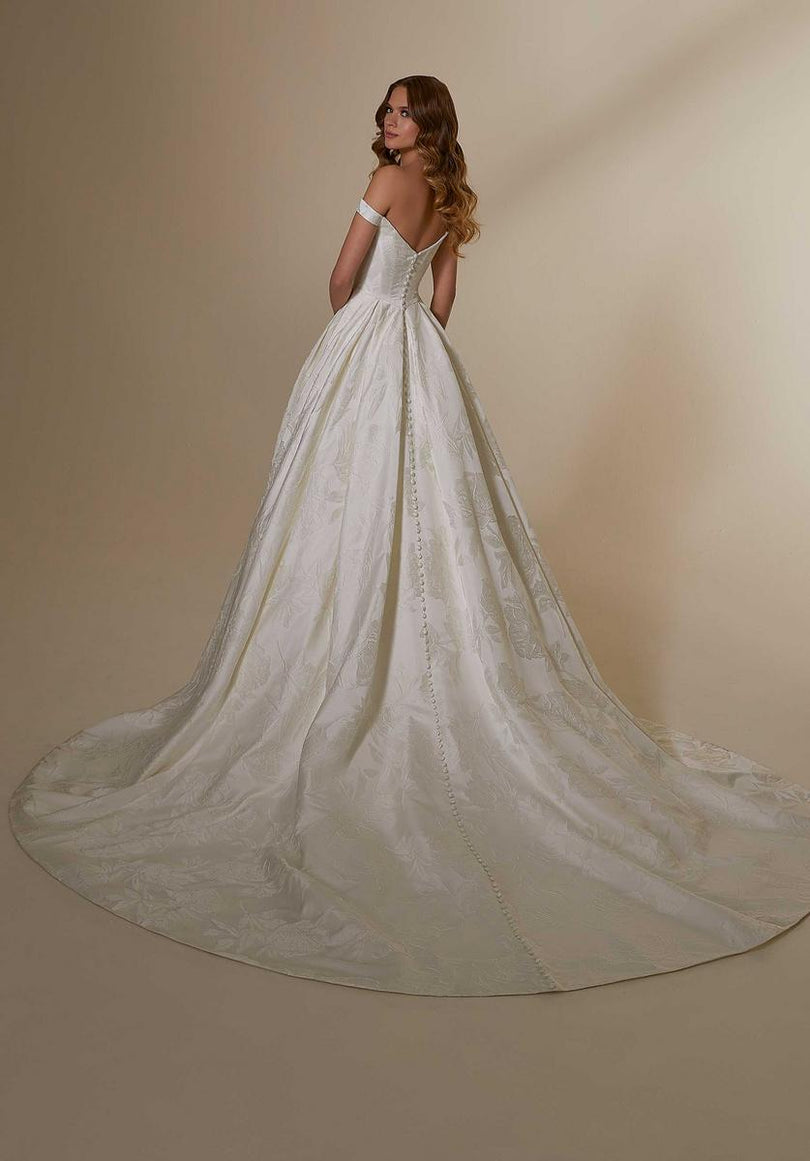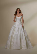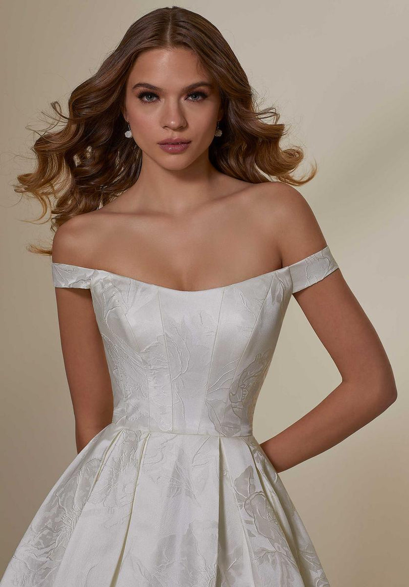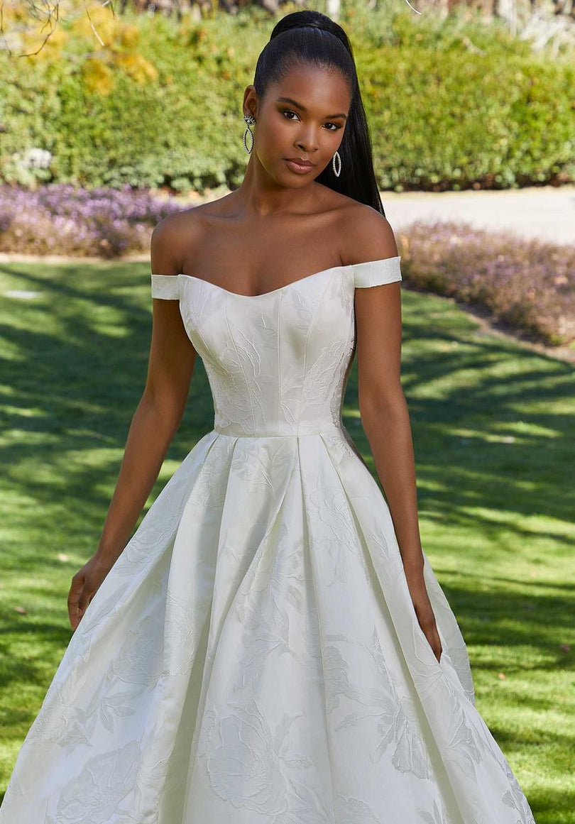 The Marquesa gown from the Fall 2023 Morilee bridal gown collection is all about decadent design. The beautiful brocade ball gown feels unique with its textured floral pattern and off-the-shoulder bodice featuring contoured seaming. The pleated skirt and buttons to the hem are a classic touch that makes this dress a timeless choice, whether you're planning an elegant formal occasion or a vintage-inspired outdoor ceremony.