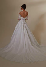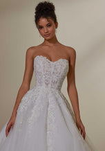 We're obsessed with this classic princess bridal gown--fit for your Disney-inspired ceremony or modern yet classic aisle style! Mabel was designed for the Fall 2023 Morilee Bridal Gown collection and we are loving her romantic vibes! She features glamorous, crystal beaded, lace appliqus that cascade down from the beautiful boned bodice. The delicate draping over the lace creates an ethereal effect, while the full tulle skirt and detachable, draped illusion long sleeves add to the regal look. Designed with a trendy illusion bodice, consider adding lining for a more modest bridal gown look (2549L).