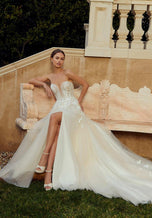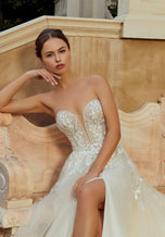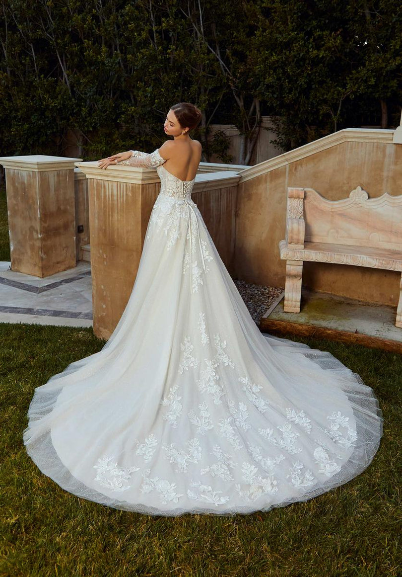 Channel your inner renaissance goddess with the Morilee Raphaella designer wedding dress. This A-line gown embodies timeless elegance with a touch of modern romance. The stunning silhouette features a plunging sweetheart bodice adorned with intricate crystal beading. Delicate floral embroidered appliqus gracefully cascade down the shimmering sparkle tulle skirt, adding a touch of whimsical charm. The lace-up corset back evokes a fairytale aesthetic, cinching your waist for a flattering and unforgettable look.Complete your regal transformation with the matching detachable long sleeves (available separately). These sleeves add a touch of drama and coverage, creating a truly versatile look. The Morilee Raphaella (style 2653) comes in a captivating Ivory/Prosecco/Honey colorway, ensuring you'll be a radiant vision as you walk down the aisle on your special day!