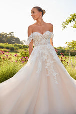 The Morilee Spring 2025 Saoirse wedding gown is the perfect choice for a bride who loves romance and charm. This captivating ball gown features a timeless sweetheart bodice with structured corset boning for a sophisticated touch. Whimsical beaded lace appliqus adorn the flowing tulle A-line skirt, adding a delicate and feminine feel. With detachable floral lace sleeves, the dress offers versatile styling for a light, airy look ideal for a garden or outdoor celebration. Style 2728 is effortlessly elegant and beautifully designed for a truly unforgettable day.