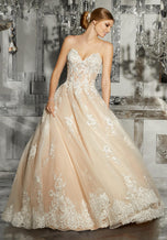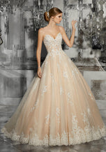Mariska is style 8187 from Mori Lee's Fall 2017 bridal collection. This tulle ball gown has a scalloped hemline and embroidered Alenon lace on the sheer bodice and full skirt. You will love the delicate beaded straps. Perfect for your formal wedding or debutante ball (matching satin bodice lining included). Available in white, ivory, and ivory/nude (pictured). Please call our Dallas, Texas location for in-store availability and to check current ship dates.