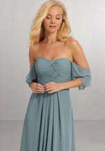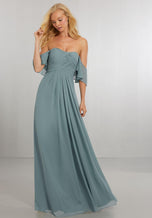 Style 21571 is a boho-chic style from Mori Lee's Spring 2018 bridesmaids collection. Softly draped, this a-line chiffon gown features a scooped neckline and off-the-shoulder flouncing. Your ladies will love the flatting cut and scoop back. Please call our Dallas, Texas location to check in-store availability, pricing, and current ship dates. Swatches available in-store. Shown in Deep Sea.