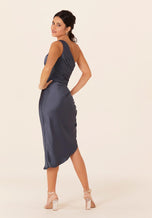 This classy midi-length gown is suitable for any Bridesmaids to a guest of! 21823, is designed by Morilee from Fall 2023 and displays a chic one-shoulder neckline with ruched detail along the side, giving you an hourglass effect. The gown is completed with a unqiue asymmetrically cut skirt. Classy midi-length bridesmaid dress has a chic one-shoulder neckline with a ruched detail along the side and an asymmetrically cut skirt. Shown in Dusk. View swatch chart for available colors.