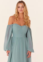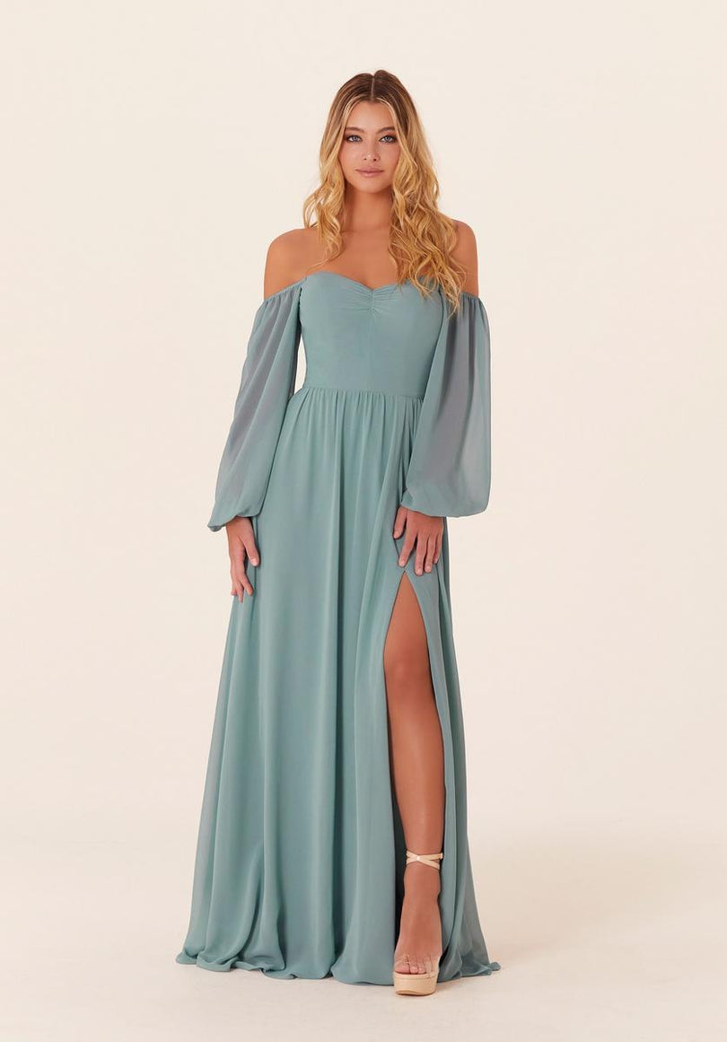 21830, is a fabulous bridesmaid gown that will give us all the boho vibes! Appropriate for an outdoor to indoor wedding, this lovely gown displays a sweetheart neckline with bishop sleeves that van be worn on and off-the-shoulder, giving is two looks in one! The skirt has a side leg slit and tie detail on the back. Made in delicate chiffon fabric, this gown will have you comfortable all night long! Give us a call for additional details on this gem!