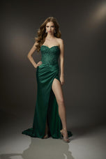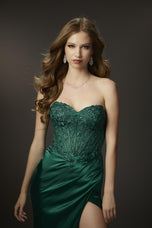 Slay the night in this fierce fitted prom dress created in luxe satin fabric. This Morilee Prom gown is from Spring 2023 Collection that has a boned sweetheart bodice designed with vine-inspired beaded lace appliques. The seductively high skirt slit adds a sultry touch to the dress!