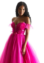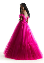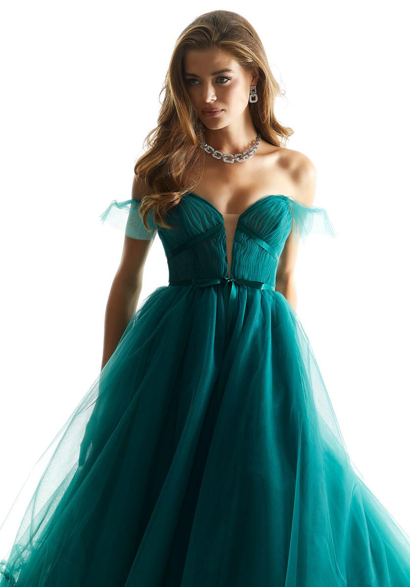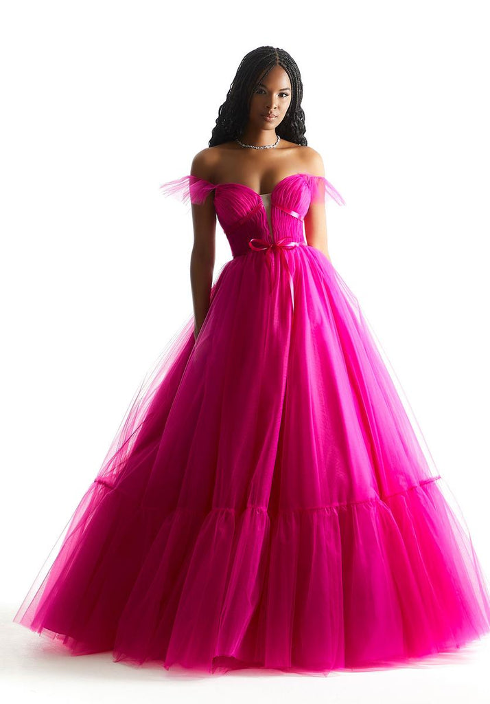 49022, is the perfect gown for masquerade theme and much more! Created by Morilee from Spring 2024 Collection, this gown displays an off-the-shoulder plunged neckline with beautiful, draped tulle and satin ribbon accents. A full boho- inspired flounced tulle skirt that will sway beautifully with every dance move you make. Find this beauty at Terry Costa!