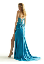 A chic prom dress made just for you! 49027, displays a bustier style bodice, strapless sweetheart neckline and an eye-catching lace-up back for a snug fit. Decorated with sparkling heat stones, this gown will have you sparkling from all angles. The silky satin skirt will hug on your perfectly and is finished off with a scandalous side leg slit and train. Grab yours now at Terry Costa!