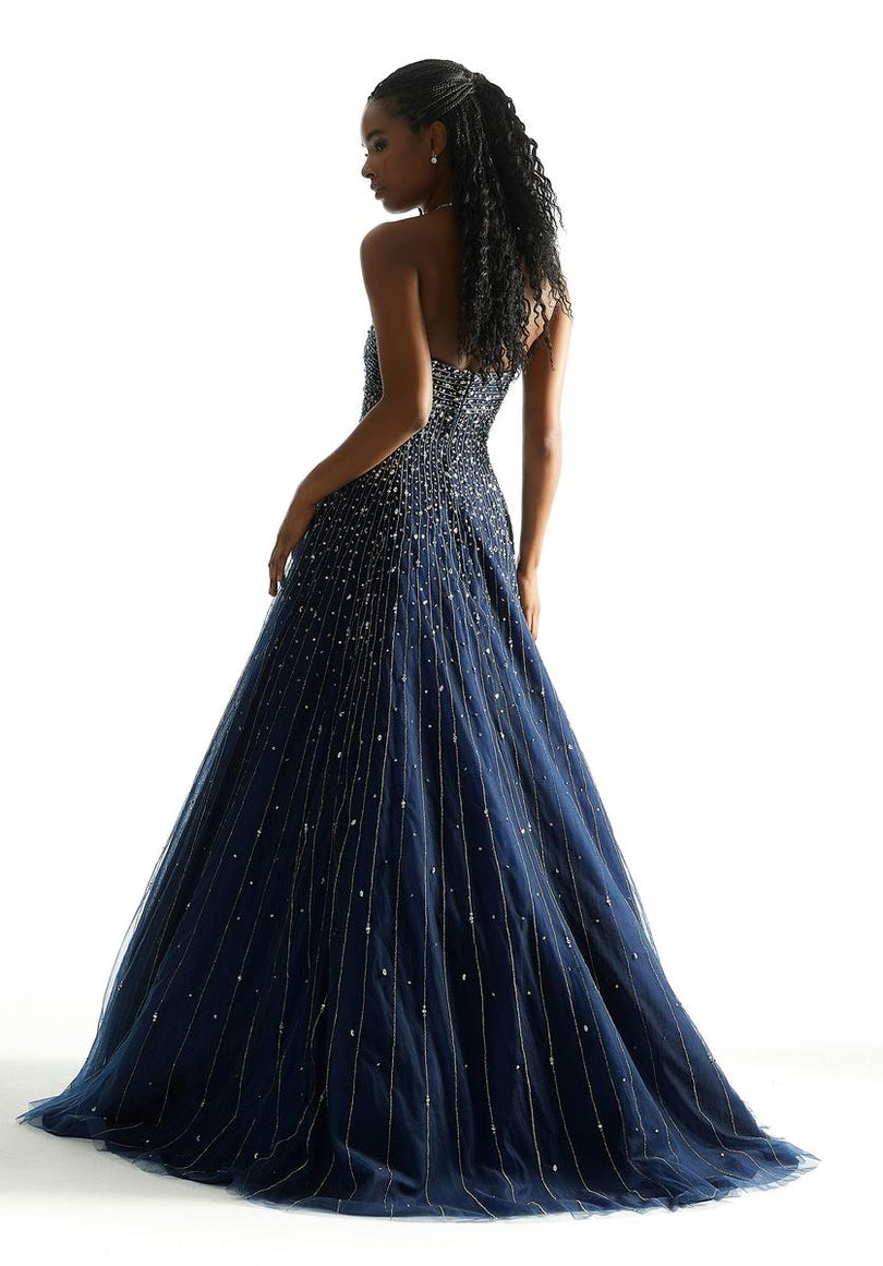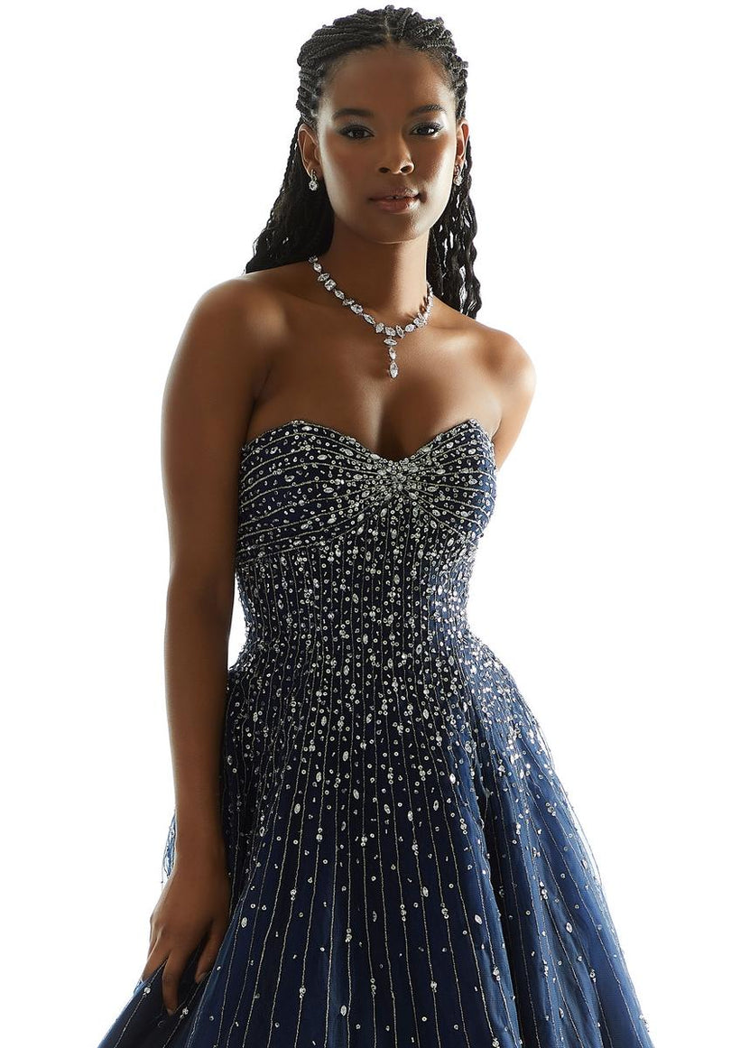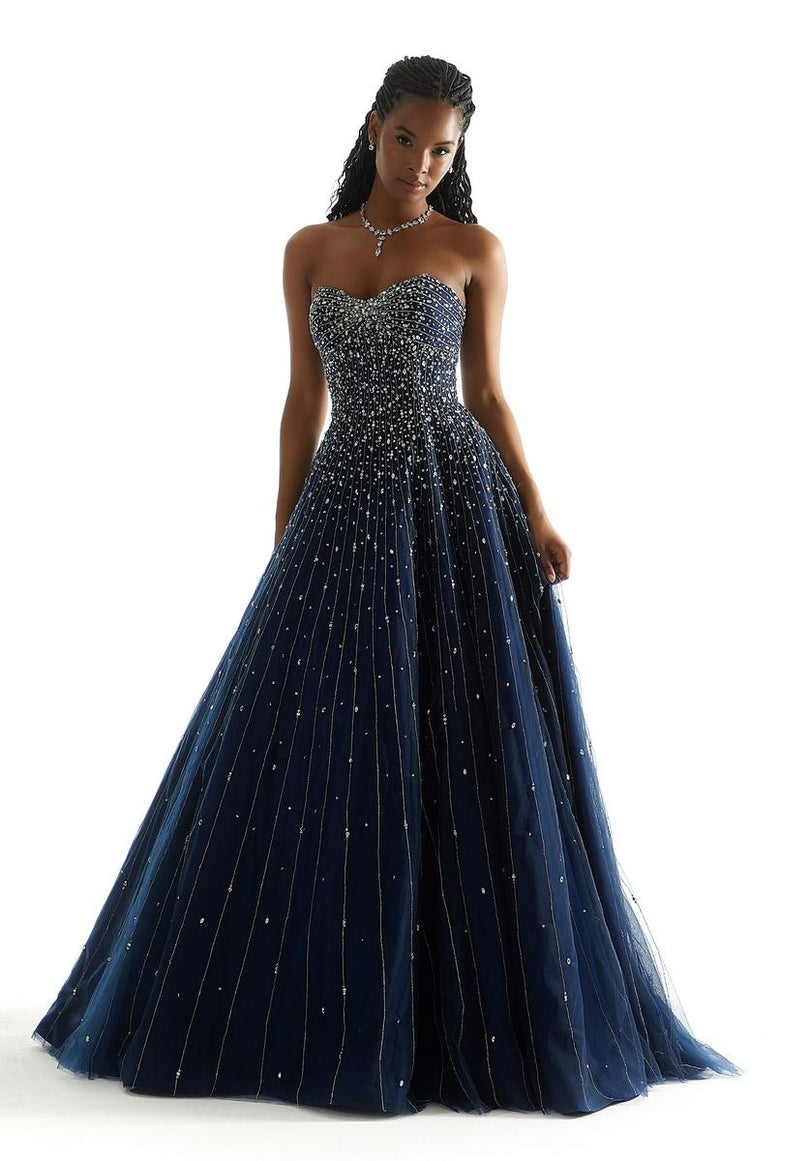 Look like a princess when you wear this beautiful Morilee ballgown. 49051, features a strapless sweetheart neckline on fitted bodice. A unique touch of linear bead work that scatters evenly throughout the Aline tulle skirt. So, shine radiantly on the dance floor when you showcase this beauty to any special event.