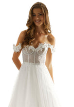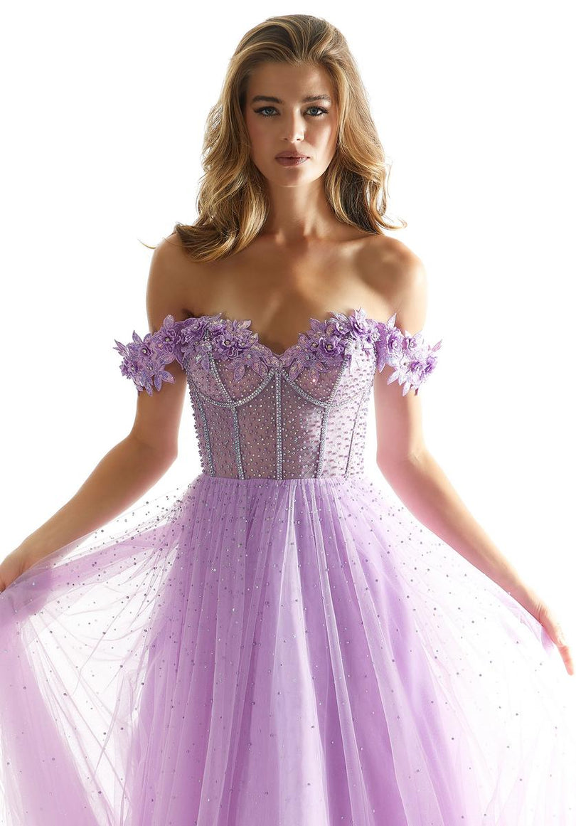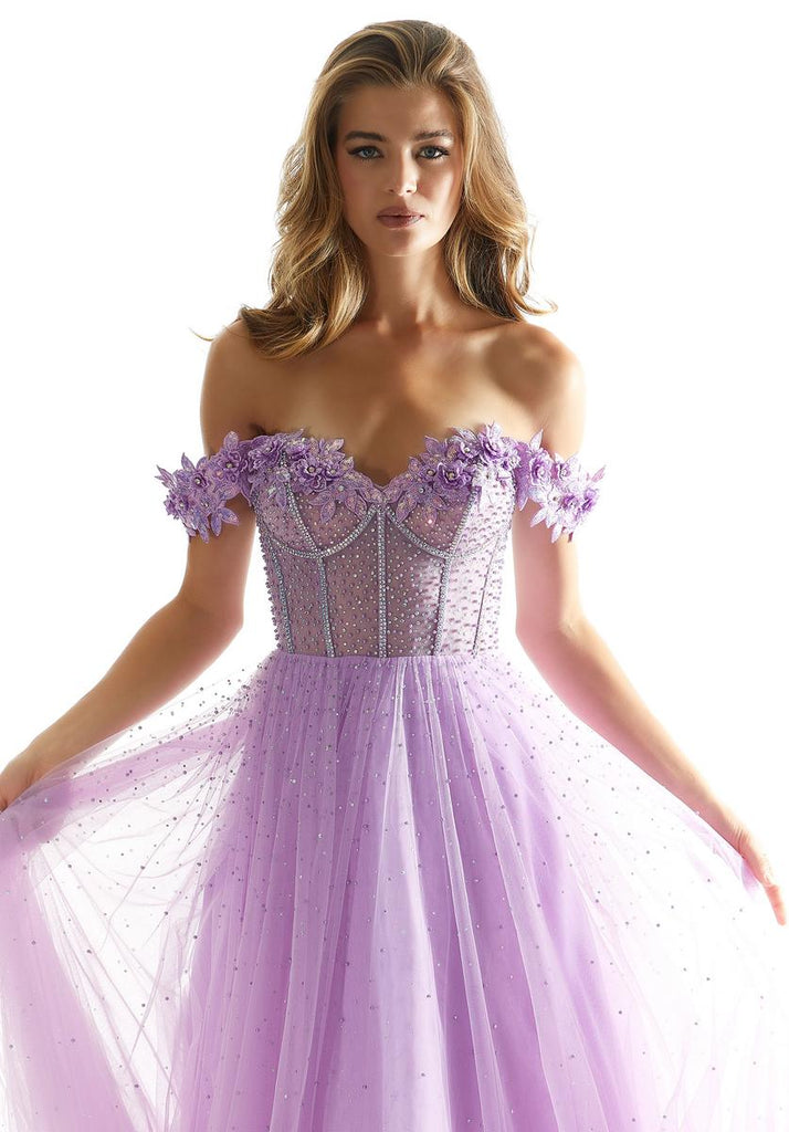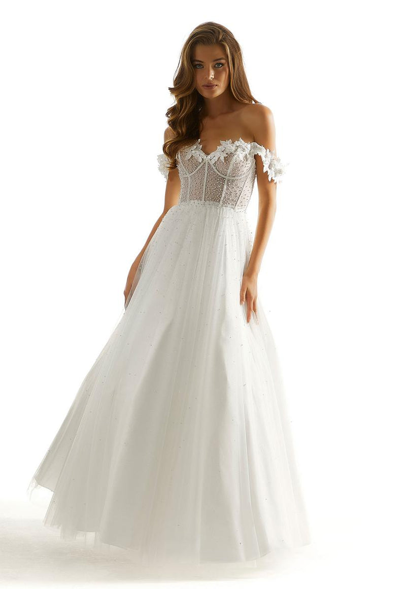 Be the Belle of the ball in this glamorous Aline gown designed by Morilee, 49075. This stunning gown features an off-the-shoulder sweetheart neckline on corset top with three-dimensional floral detailing. The full tulle skirt has glitter that will have you sparkling from all angles! Make this this your go to for any special event.