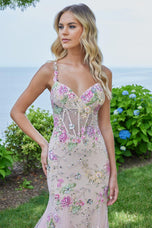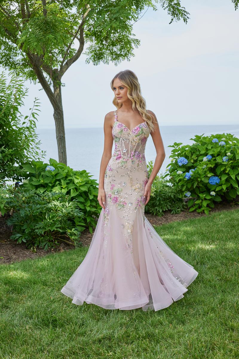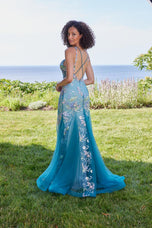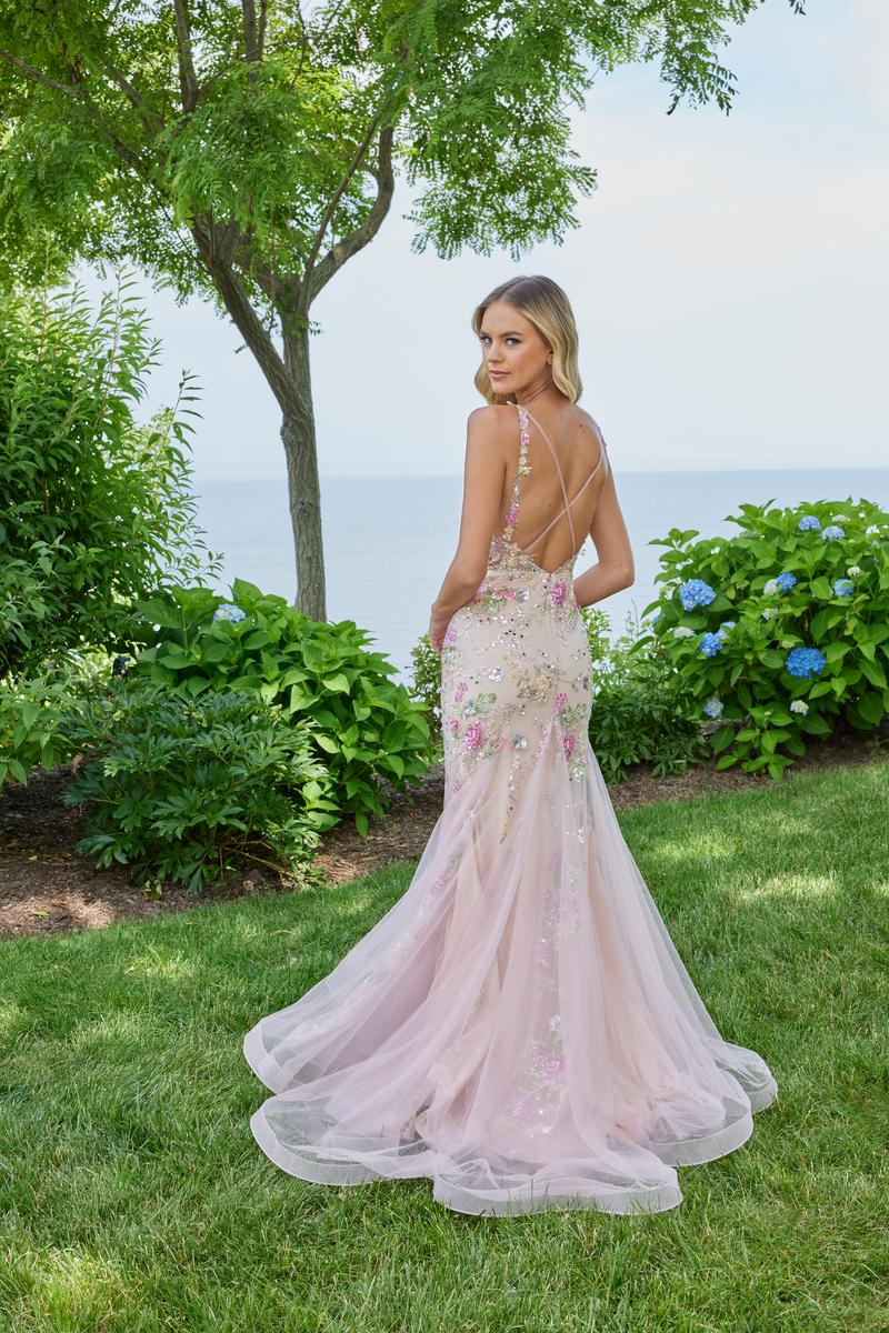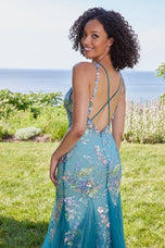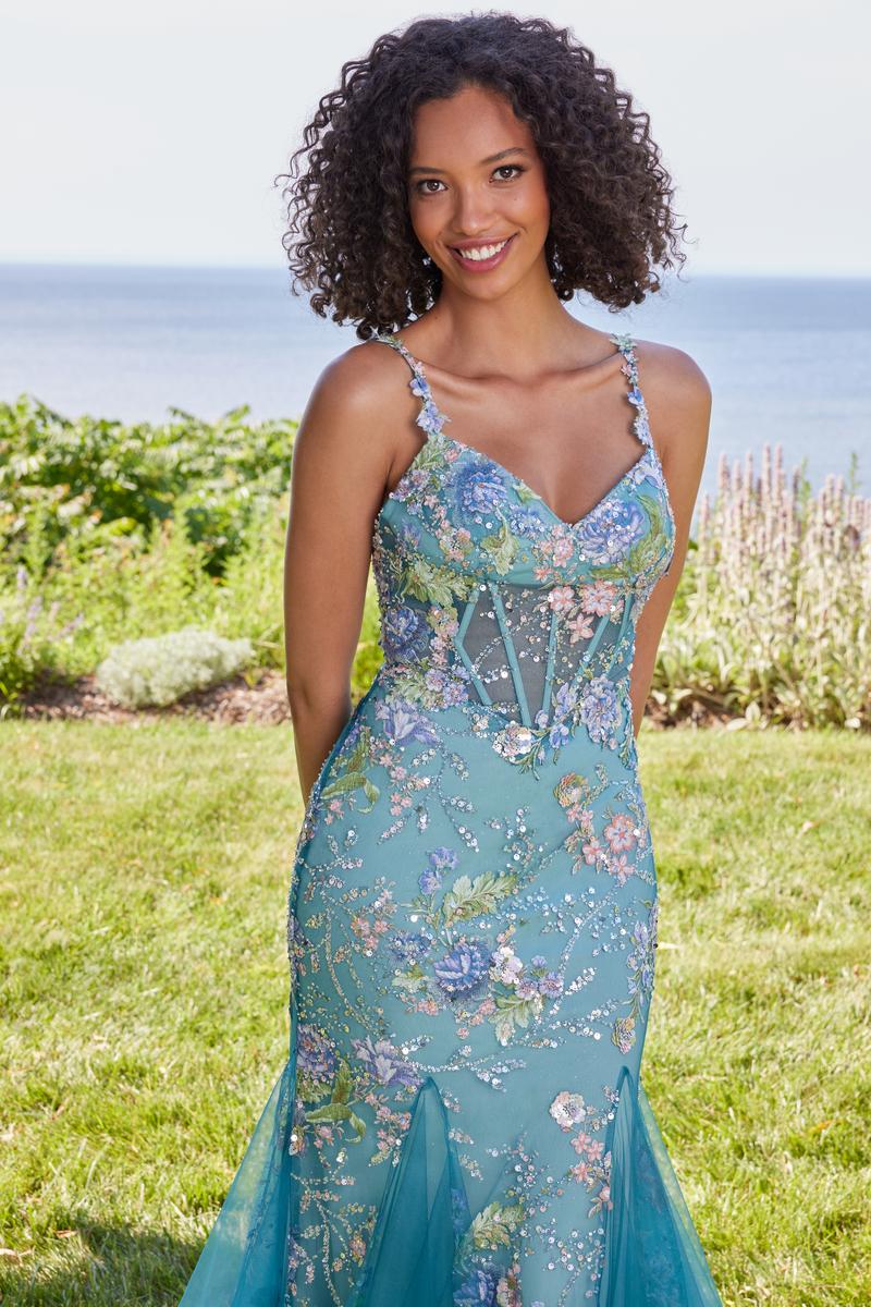 Dive into the deep waters of mermaid magic with the water-inspired gown that'll have you feeling like a sea goddess! The form-fitting design hugs your curves in all the right places, while the v-neckline gives you that WOW factor. The sheer boned bodice adds that edgy twist while the open back gives you a sultry taste. Stunning multicolor floral beading adds a pop of color that sparkles like the ocean at sunset, and the godet inserts of tulle make sure you have that wave-like movement while you dance. With its floor-length elegance, this gown is perfect for your prom!