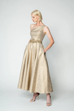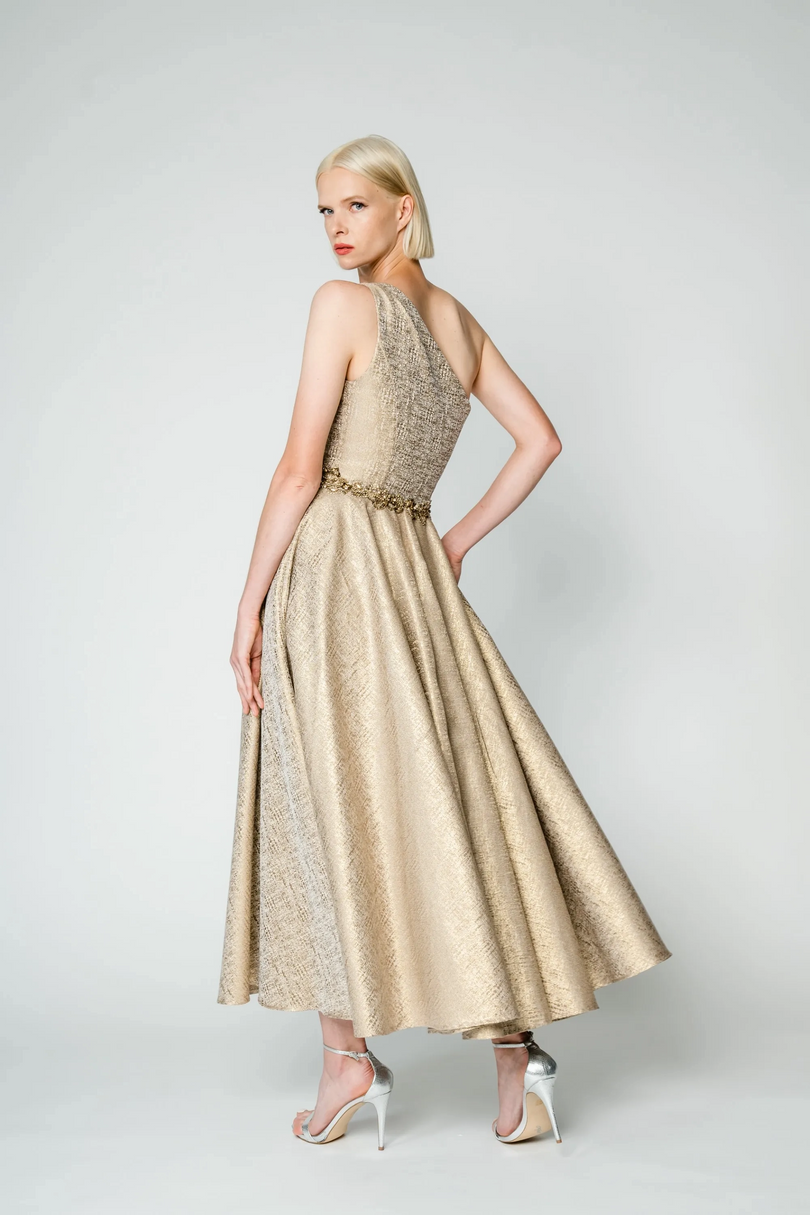 Simply stunning and ready to shine! The Park 108 by Hynes Park One Shoulder Tea Length Dress M320 dazzles in gold with an embellished empire waistline, heat stones, and textured fabric. This dress is a final sale. No Returns or Exchanges.