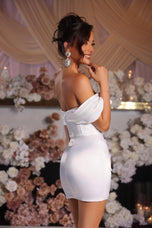 Portia & Scarlett PS25564 is the ultimate mix of sexy and sophisticatedperfect for the bride whos ready to celebrate in style! This strapless bridal mini features a curve-hugging sheath silhouette that shows off your figure, while the off-the-shoulder cuff sleeves add a modern, high-fashion touch. Sleek and structured, the bodice gives just the right amount of support while keeping the look chic and polished. Whether you're heading to a reception, bachelorette party, or planning an informal I do, this dress brings the fun. The short length makes it flirty and dance-floor ready, while the clean design keeps it timeless and effortlessly cool. PS25564 is made for the bride who wants to make a statementbold, beautiful, and totally unforgettable.