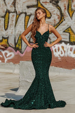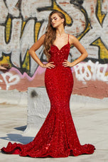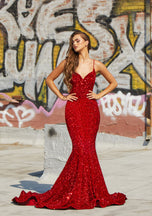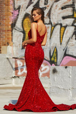 Long fitted sequined velvet prom dress from the Portia and Scarlett collection! You'll slay at prom or homecoming with this stunning tight-fitted prom dress! The fitted bodice is accented with a v shaped sweetheart neckline. The fitted mermaid silhouette on this long prom dress has a sweep train with a horse hair hem for dramatic detail! You'll love the ultra glamorous fabrication on this gorgeous sequin prom dress! Call us a Terry Costa for availability.