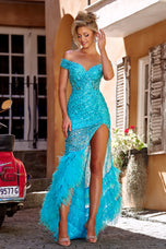 Dazzle in this long off the shoulder prom dress from the Portia and Scarlett prom dress collection!