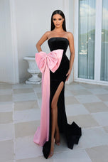 SLAY QUEEN! This Portia and Scarlett evening gown is timeless! PS23040, features a strapless neckline and zipper back closure. The velvet made gown is a figure-hugging silhouette with an eye-catching oversized bow detail and side leg slit. Let your search come to an end and take this beauty home!