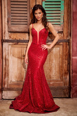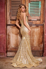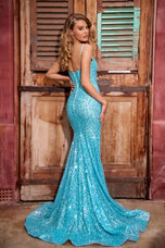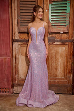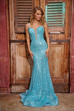 Be the center of attention at your social event in this sophisticated Portia and Scarlett gown. PS24038, will boost your confidence with the curve hugging silhouette. Decorated with eye-catching sequins, a corset bodice with plunge neckline and dainty straps. The entire ensemble is so captivating and is completed with a sweep train. Perfect for Prom, Sorority formal, Gala and much more.