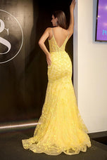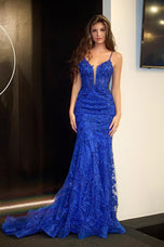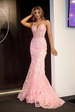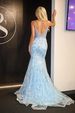 Who doesn't love lace and tulle? This form fitting gown is covered with lovely delicate lace detailing on tulle fabrication. The curve hugging silhouette displays a v cut neckline with plunge on corset top, and dainty straps. garnished with hot fix throughout the gown, this is the perfect attire for you to showcase. For additional details, give us a call at Terry Costa or visit us in store.