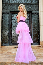 Get noticed and set the trend in this lovely pink Aline high-low by Portia and Scarlett, PS24696. The top features a strapless neckline with ruched tulle that creates a crumb catcher top. The empire waist will make sure they still see your perfect figure. A stunning and tiered tulle skirt that creates the high-low effect!