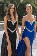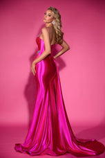 Hot pink fireworks in dress form, this Portia and Scarlett gown turns every step into a main character moment. The fitted satin silhouette hugs your curves just right, while thin straps and a soft sweetheart neckline frame your shoulders with that flirty, Barbie level charm. Rhinestone accents sparkle across the corset bodice like jewelry built into the dress, giving you that goddess glow without needing a single accessory. It is sexy, fun, and unapologetically glamorous, the kind of look that has everyone secretly a little jealous in the best way.The skirt glides down in smooth satin before opening into a high slit that showcases your legs and heels with red-carpet confidence. A sweeping train trails behind you, adding drama every time you turn or pose for a picture. The modest back keeps everything balanced and polished, so the overall look stays elegant even with all that attitude. Worn to Prom 2026, this gown delivers pure beauty queen energy, a pink fantasy that feels like you just stepped out of a dream and into your own spotlight.
