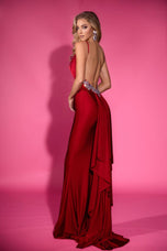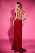 A red-hot whisper of elegance with a backstage-pass attitude, this Portia and Scarlett gown is made for the girl who wants to look effortlessly unforgettable. The fitted silhouette in smooth stretch jersey skims your curves with a clean, confident finish, while thin straps and a plunging V-neckline keep the front sleek and striking. With no slit, the shape stays refined and timeless, letting the color and cut create that enchanting, glamorous impact that feels unique and quietly powerful.The real jaw-drop moment happens when you turn around. An open back leads into a low back adorned with crystals that sparkle like tiny spotlights, adding a luxe surprise that makes every over-the-shoulder photo a winner. A ruffle detail on the sewn-in back skirt adds soft movement and a touch of drama, giving the gown a romantic finish that feels elevated and fresh. Worn to Prom 2026, this look brings pop-level confidence with polished glamour, perfect for owning the night with grace, glow, and main-character calm.
