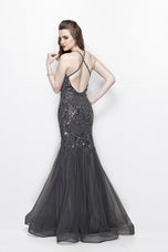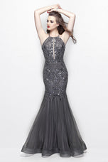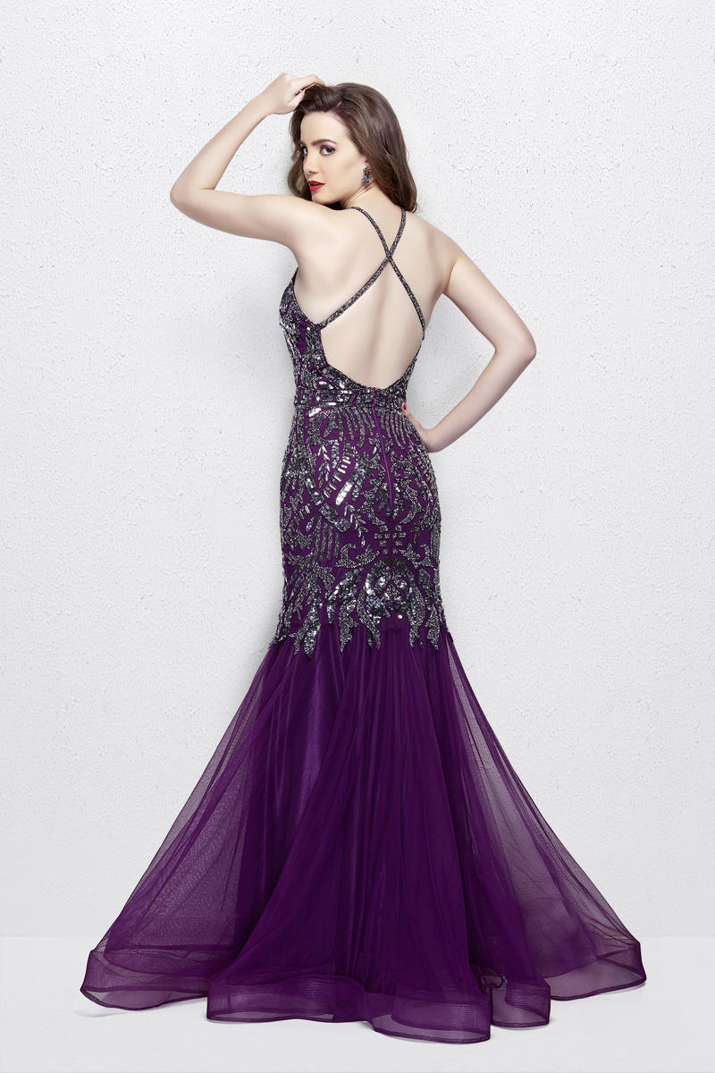 Bring on the hollywood elegance with this exquisite sequined beauty by Primavera Couture accentuated with a high neckline and dainty glimmerring straps running criss cross on the low back. The skirt has a mermaid silhouette with layers of tulle fabric and a full length hem. Available in Charcoal & Plum.