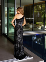 A bright and bold Primavera gown is the way to go! 4112, displays a modest one-shoulder neckline with fun feather detail. The beading on this gown is breathtaking, decorated with rays of sequins that will give you a slimming effect, this is one you don't want to miss out on! The long skirt has a side slit and train. Perfect for Senior Prom and much more.