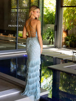 Turn heads when you showcase this stunning Primavera gown from Spring 2024. Fully embellished with gorgeous pattern of sequins and beads, this gown showcases a fitted silhouette with v-neck, dainty straps, and lace-up back for a snatched waistline. The long straight skirt has ruffle tiered layers with beading. So fun and so sparkly, perfect for any event!