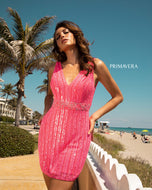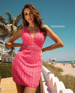 Be the talk of the night in this hot pink short fitted gown designed by Primavera. 3505, showcases a deep v-neckline, thick beaded straps, thick solid beaded band to accentuate your figure. Vertical beadwork adorns this gown. perfect for Hoco!