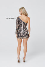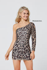 Embrace your uniqueness in this one of a kind shirt cocktail gown designed by Primavera. 3528, showcases a one-shoulder neckline with one side long sleeve. the fitted silhouette will flatter your figure perfectly and is adorned in sequined animal print! Perfect for Senior prom or Homecoming!