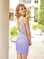 Spotlight, Flashing Lights, Red Carpet, We're Ready! Primavera style 4036 lives up to the hype! This short dress is fully sequined with a v-neckline, v-back, and trendy side cutouts. The sequins form an horizontal ombre design. Wear for homecoming dance or any semi-formal event!