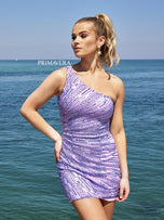 Show off your moves on the dance floor wearing a shining Primavera cocktail dress. Style 4046 is a gorgeous one shoulder mini dress with sequins and beading in a radiating pattern from the side of the dress. Wear this short beaded dress for Homecoming, Semi-Formal Event, or any Party Occasion!