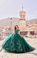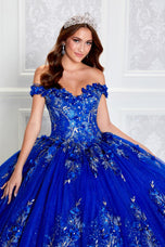The fabric in this Princesa by Ariana Vara Quinceanera dress is Embroidered Lace, Glitter Tulle, Three-Dimensional Flowers, Beading, Stone Accents . Detachable Off-the-Shoulder Sleeves, Small Cape Included