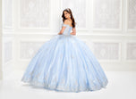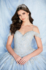 Off the shoulder novelty glitter tulle ball gown with a v-neck, off the shoulder flutter sleeve, beaded bodice with lace appliques, basque waist, corset back and lace appliques throughout the skirt. Jacket Included