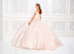 Strapless novelty cracked ice ball gown with a sweetheart neckline, beading and three-dimensional flowers on the bodice, basque waist, corset back, three-dimensional flowers and stone accents throughout the dress. Lights Included, Jacketand detachable off the shoulder strap Included.