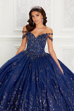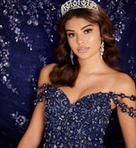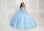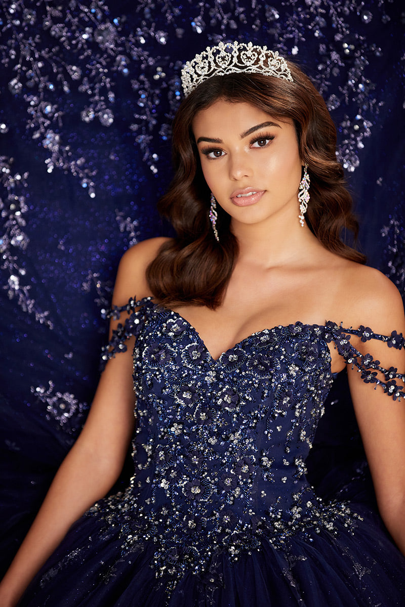 Cracked-ice and glitter tulle ball gown with a sweetheart neck, beaded bodice, basques waist, corset back, three-dimensional flowers throughout, stone and crystal accents and off-the-shoulder floral strap detail. Short Cape Included