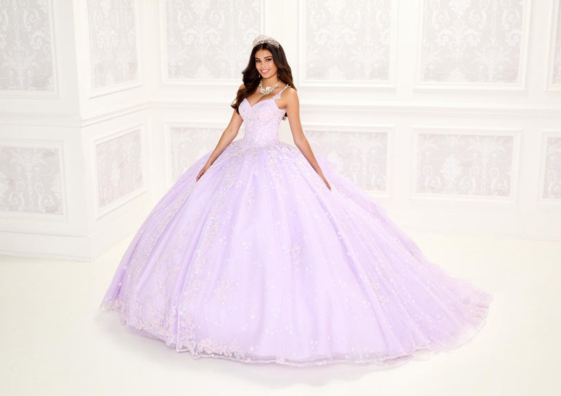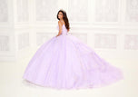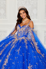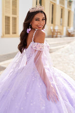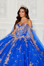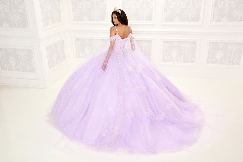 The fabric in this Princesa by Ariana Vara Quinceanera dress is Embroidered Lace, Cracked Ice, Glitter Tulle, Beading, Stone Accents . Detachable Off-the-Shoulder Long Cape Included